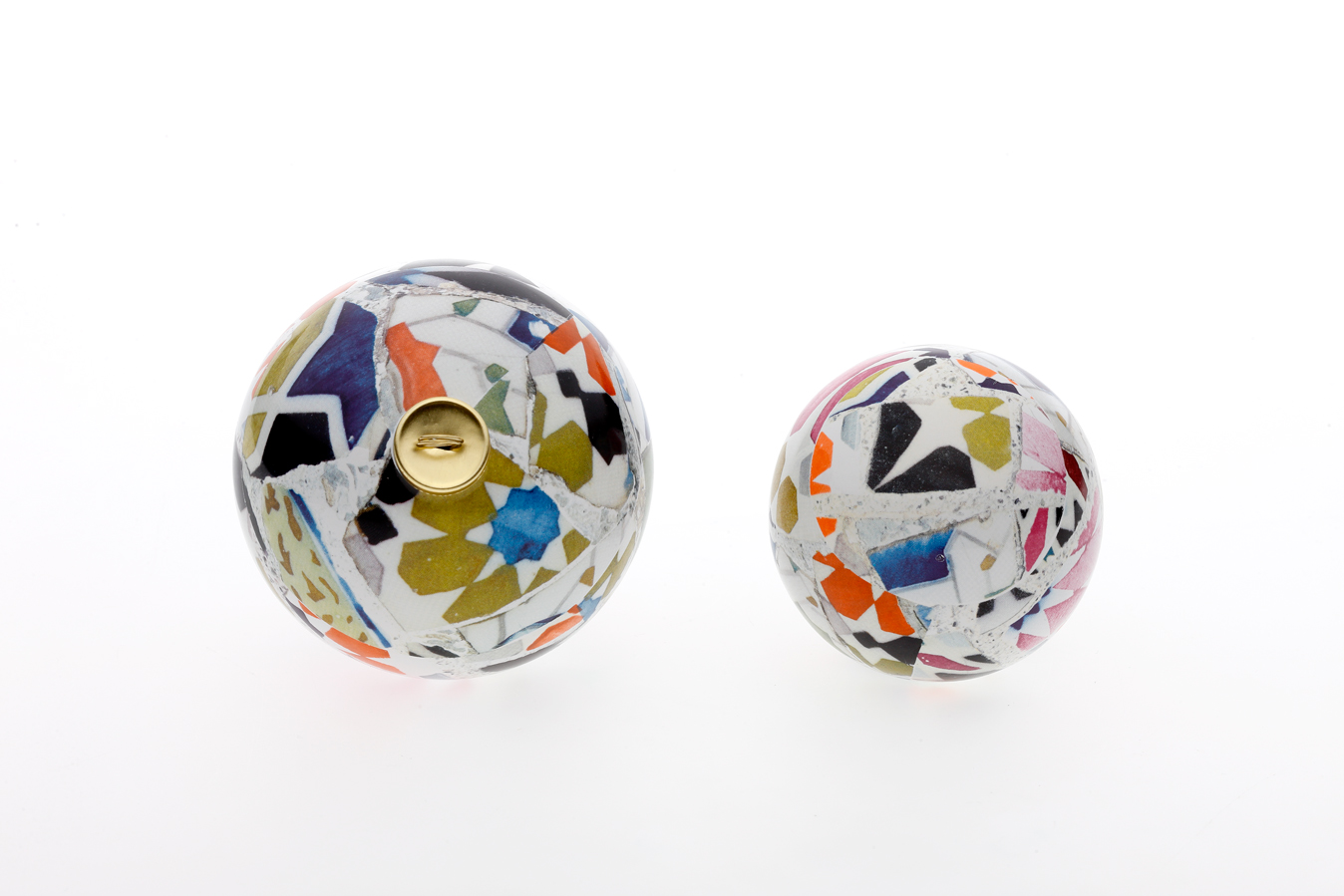 Ceramic x-mas ball inspired in Gaudi's Trencadis ceramic tiles. Available in 2 sizes (8cm & 10cm), are white glazed with application of a decal reproduction of Gaudi's tipical compositions.